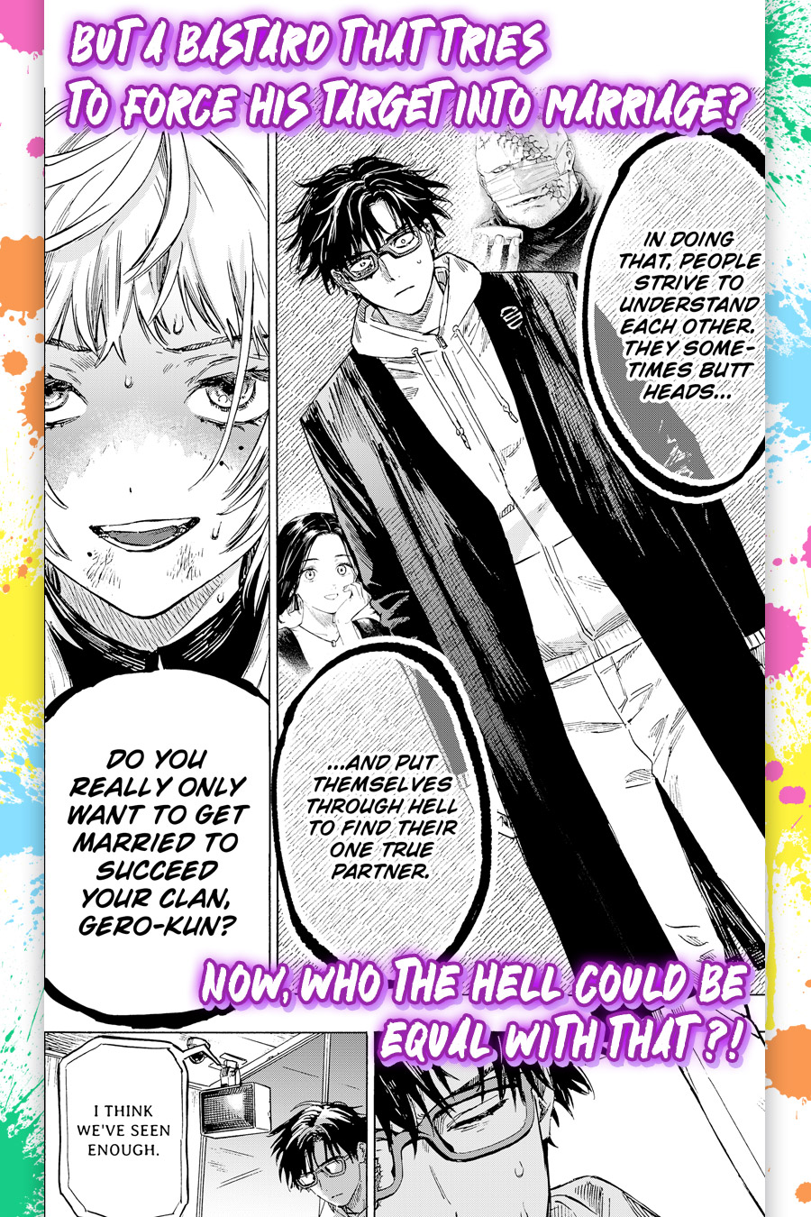 A hitman and a marriage swindler set out on the world's most grueling battle for marriage! Gero is a young man from a clan of hitmen, which has been in existence for hundreds of years. As someone who's never gone to school and lived his life dealing in the dark side of the business, he considers himself to have "no prospects with women" and marriage as "something not for him." However, one day, in fear that their lineage would dissolve, his clan warns Gero that if he doesn't marry and produce an heir, they would have no choice but to...force his little sister into doing "that." Driven to his wits' end, Gero asks the target of his work, a marriage swindler, to...