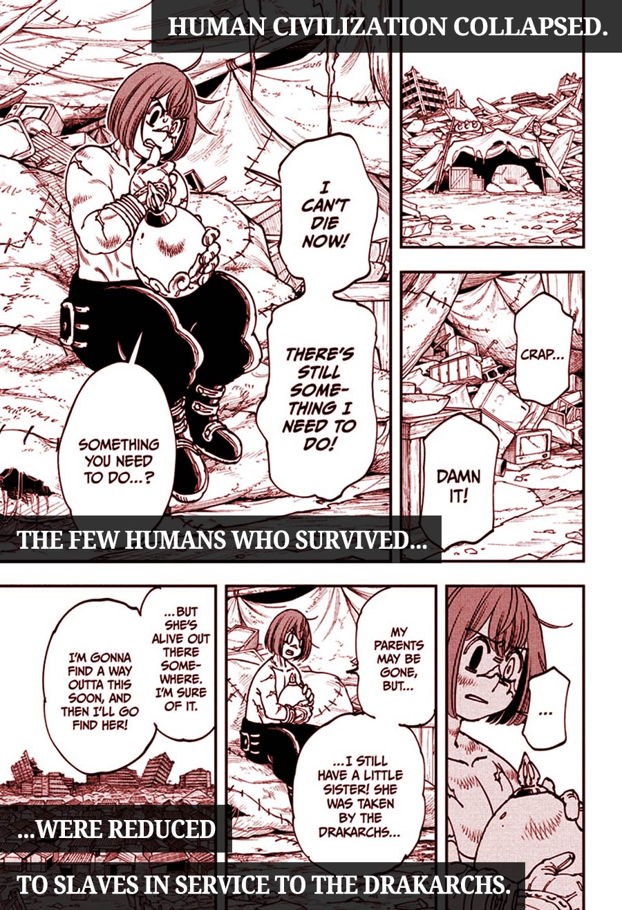 Human society has collapsed. The survivors are now slaves to powerful creatures known as Drakarchs. But when a young slave named Gonron meets a Drakarch egg named Oma, these two who share a cruel fate will need to work together. Retrieve the lost peace and dignity. Young man, the time to rebel is now!