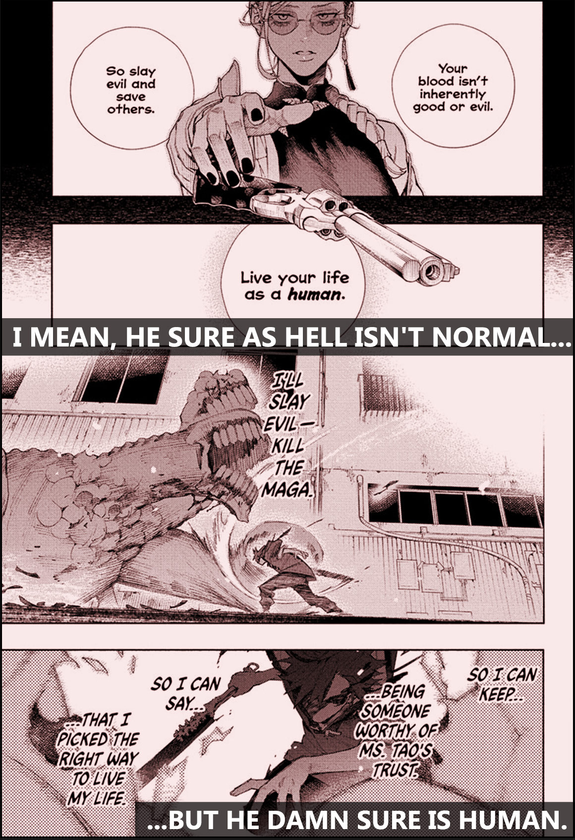 Gokurakugai, a bright and bustling working class district with a hidden dark side. In this area without order, Tao and Alma work as troubleshooters for hire. Their missions involve helping a young boy find his lost friend, a person who dissapears without a trace, and disfigured animal corpses. All the while, the evil spirits who live in the shadows bring out a different side to these troubleshooters!