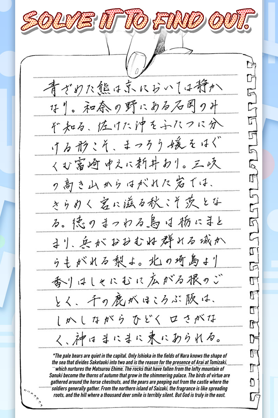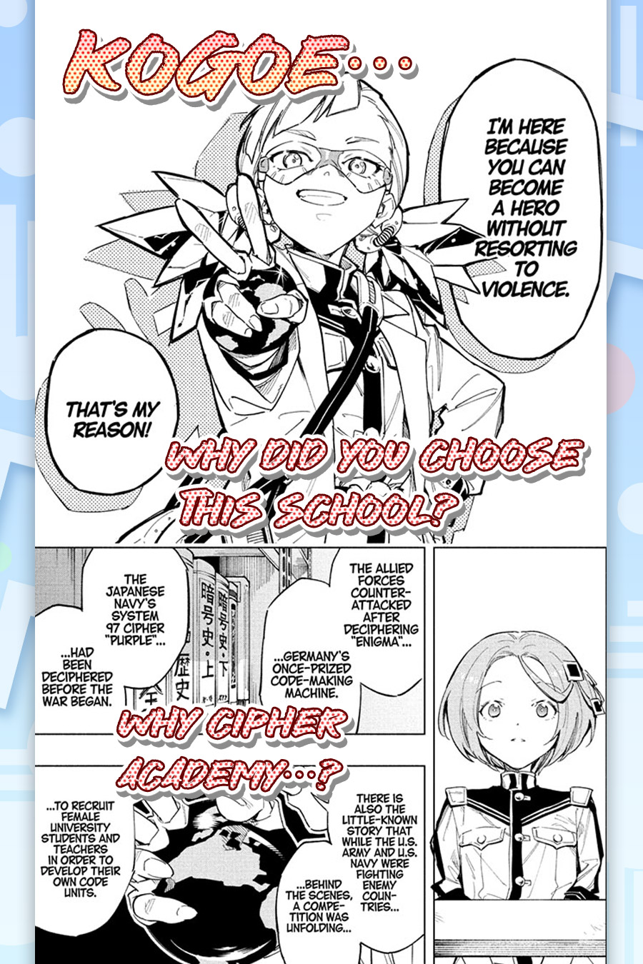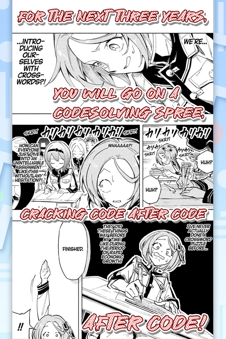 Iroha is an average student newly enrolled in Cipher Academy, a Spartan school where students must crack code after code after code with barely enough time to catch their breath! Then a mysterious person named Kogoe gives Iroha an unusual pair of glasses with a crazy secret behind them!